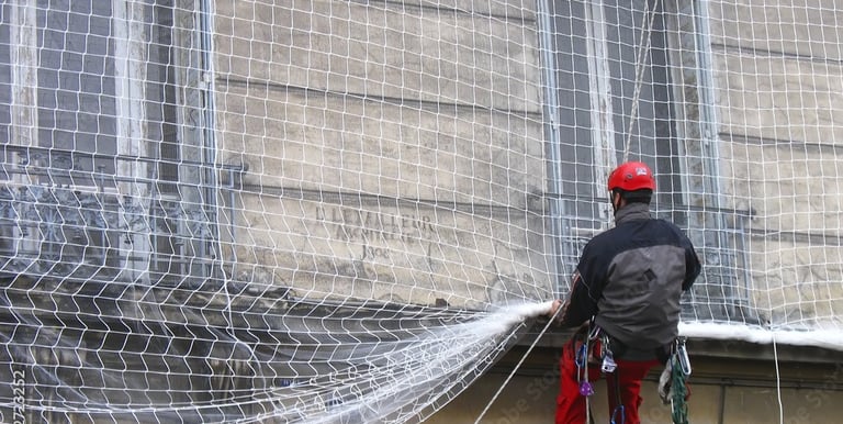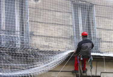 Pose de filet pare gravât pour sécuriser un élément ou une zone instable et dangereuse, balcon, cheminé, etc…