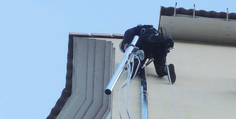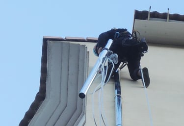 Nous réalisons tous types de travaux en hauteur, qu’il s’agisse de maçonnerie (réparations, épaufrures, enduits, etc.), de travaux d’entretien et de réparation de toiture (zinguerie, remplacement ou remaniement de tuiles, pose et réparation de gouttières, installation ou dépose de descentes d’eau pluviale, etc.) ou encore de travaux de peinture en hauteur (façades, garde-corps, etc.). Voici quelques exemples de travaux courants :